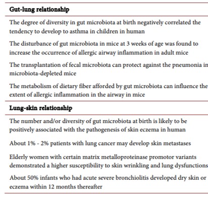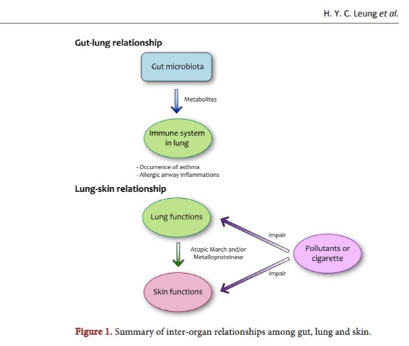 For the large intestine-lung relationship, experimental evidence supports a relationship between the composition of micro bacteria in the large intestines and lung function. It has been suggested that the microbiota of the two organs communicate and somehow influence each other. It appears that large intestine microbiota can change during infancy, but becomes less sensitive to change in later stages of life. For the lung-skin relationship, the pathological relationship between the two organs is becoming evident in regard to allergic diseases, as demonstrated by the phenomenon recent research has uncovered called “atopic march” (an apparent co-occurrence of skin and lung allergies, in that atopic dermatitis in infancy tends to be followed by allergic rhinitis and asthma later in childhood).
